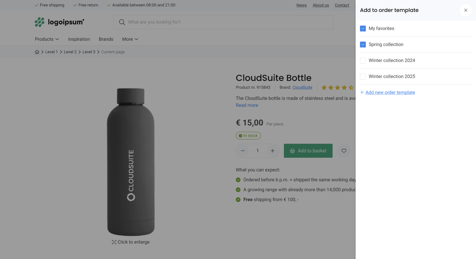 Most order templates can be managed from My Account but also directly from the Product Detail Page (PDP) or Product Listing Page (PLP). Some are only editable if you are an internal user (usually an eCommerce manager or shop manager), like Shop template and Customer template.