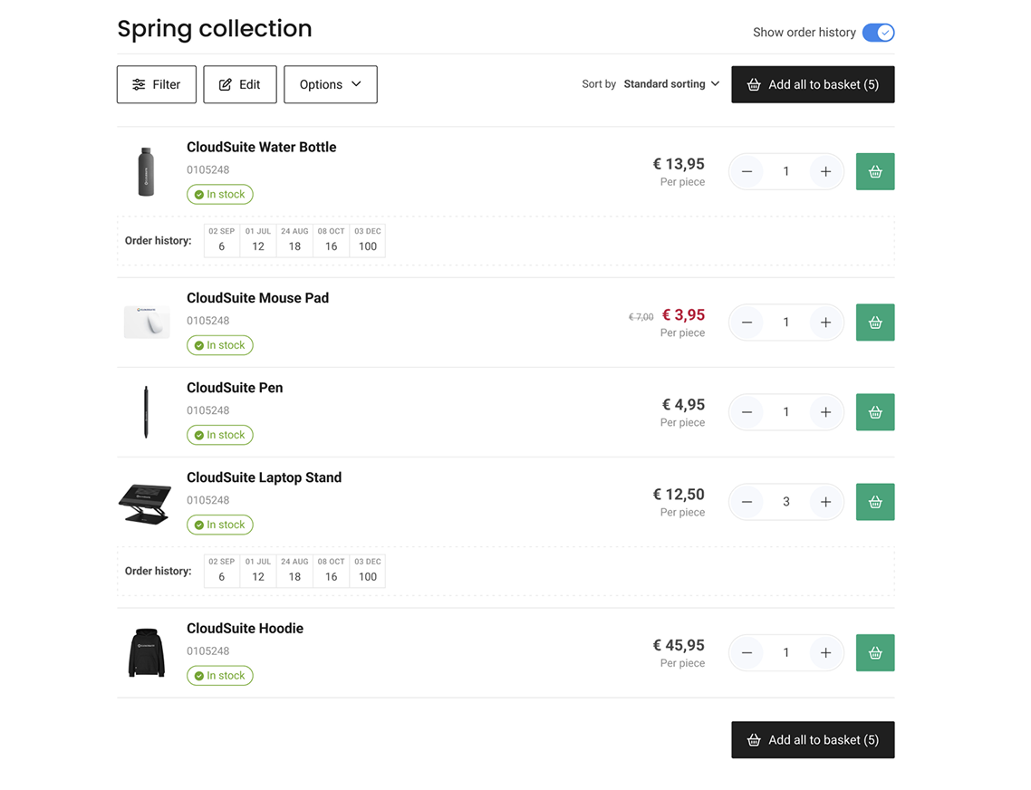- Order all products with set quantities — allowing customers to quickly re-order.