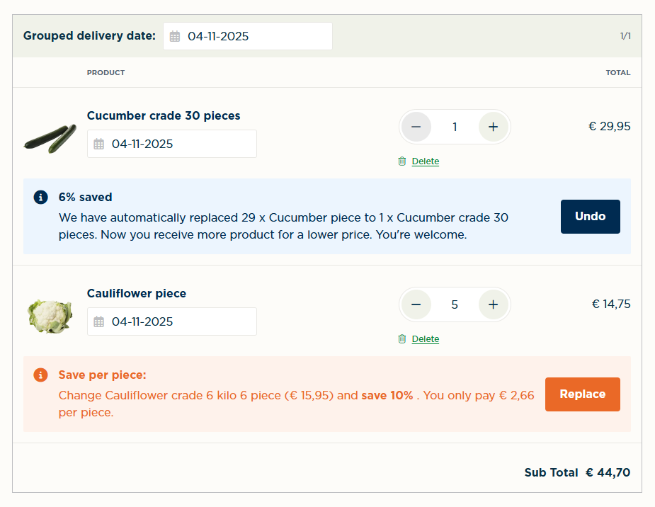 - When the price of a full box is lower than that of the number of products ordered the conversion can be done automatically. A nice advantage; additional products for a lower price. If the customer still wants to order fewer items, the choice can still be made to undo the change.