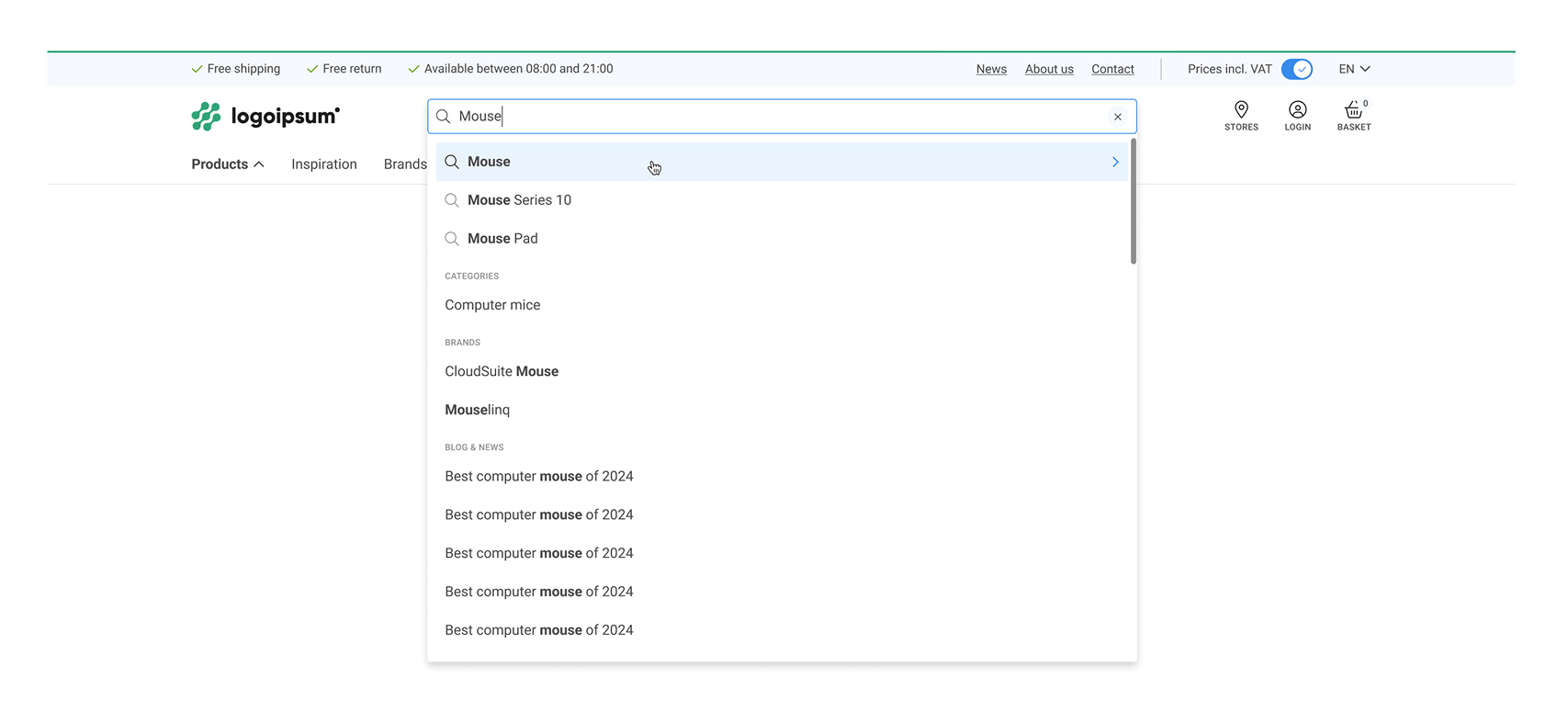 You can refine the search results by showing related product categories, popular products, or product suggestions related to the entered search term. In addition, you can choose to exclude specific fields for suggestions, e.g. product numbers or codes that are specific and may lead to ordering the wrong products.