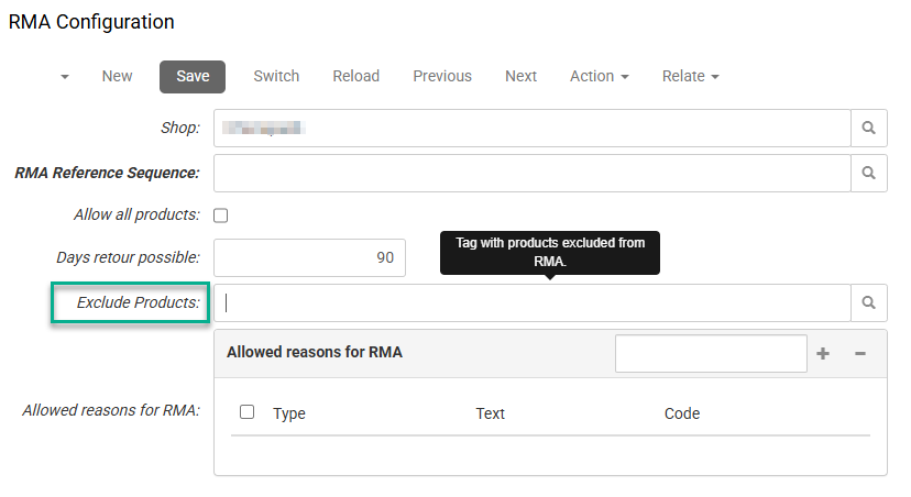 - In the CloudSuite App, go to Order Management > RMA > RMA Configuration and open the shop from which you want to exclude products for returns.