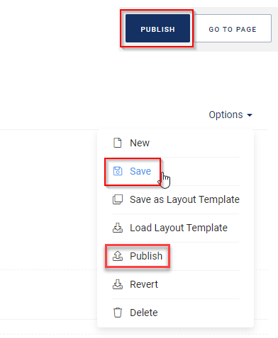 When you are done, select Save from the Options menu to save the page. Then select Publish from the same menu, or click the Publish button to publish the page online.