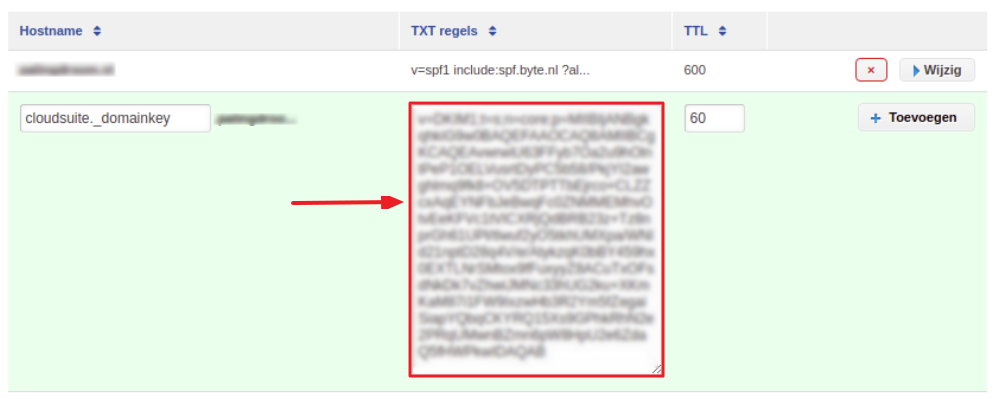 Then, contact your system administrator or hosting partner to modify the DNS of the domain. The DKIM DNS info content must be added as a TXT record to the DNS of the configured domain. Open the DNS settings for the configured domain and create a new TXT record with the specified name and content.