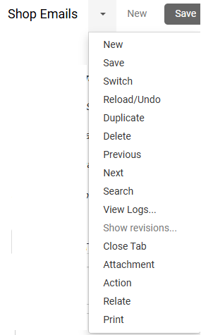 To the left of the top menu, a drop-down menu contains further management options, as follows: