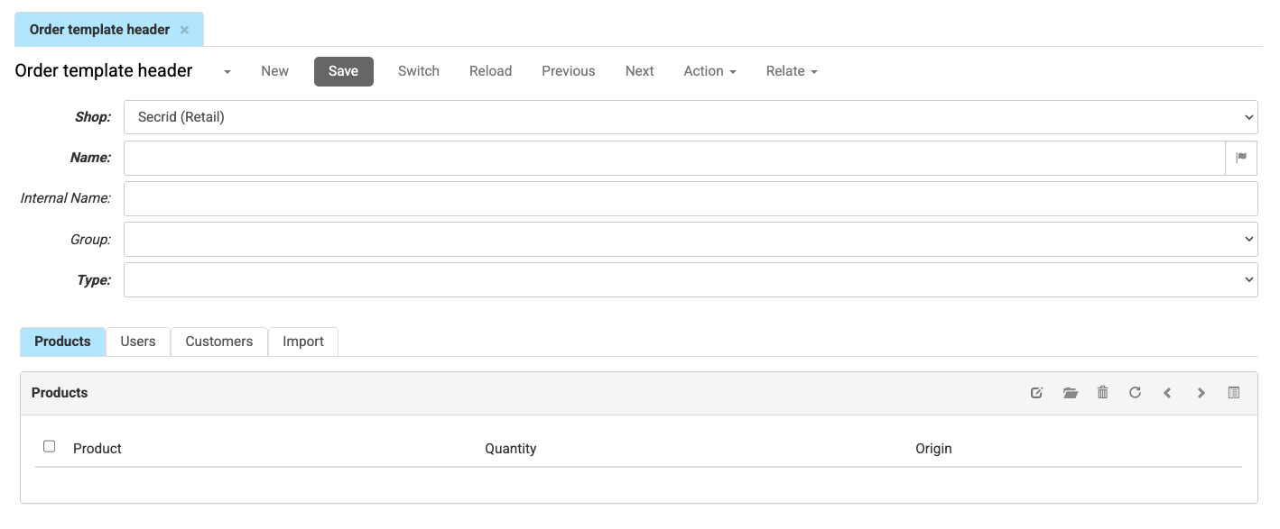 To work with order templates, in the CloudSuite App go to Order Management > Order Templates > Templates. An overview appears, listing all order templates that have already been defined. Double-click an existing template to open its details or click New to create a new one.